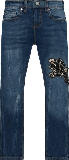 These kid-size skinny jeans are made for comfort from stretchy denim and finished with an embroidered graphic at the thigh.
