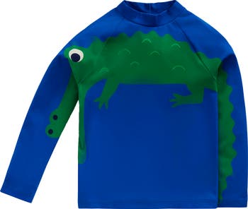 They'll love the playful alligator made with three-dimensional teeth that detail the sleeve of this stretchy rashguard.