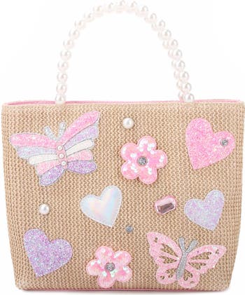 Embellished appliqués shimmer against the woven straw exterior of a kid-sized tote finished with faux-pearl top handles for an added dose of charm.