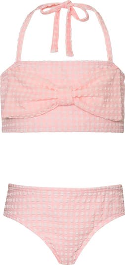 A fun print, textured, quick-drying fabric and bow add to the fun of this two-piece swimsuit made just for kids.
