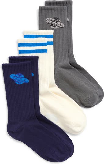 Ringed planets and rings of colorful stripes bring fun options to a three-pack of crew socks made for kids who like to explore the universe in sporty comfort. Made of organic cotton and recycled fibers, they keep every step breathing easy and smartly grounded.