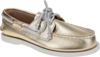 Traditional detailing makes an easy favorite of a kid-size boat shoe that's topped with premium leather and hand-stitched to provide signature comfort of a Sperry icon. Rawhide laces wrap the heel and tie at the bridge for a custom fit, while a signature wave-siped tread provides confident footing on wet and dry surfaces.