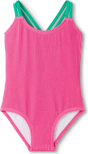 Make your little one's seaside days memorable in this textured one-piece swimsuit trimmed with contrast straps that form a strappy crisscrossing back.
