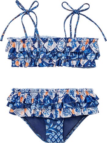 Rows of ruffles lend lots of movement to this stretchy swimsuit topped by dainty ties that give them a perfect fit.