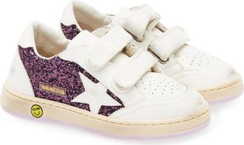 Inspired by '80s American college basketball, this glitter-dusted sneaker is lightly scuffed and smudged to look like your kid's already made the varsity squad.