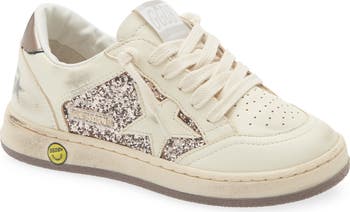 Inspired by '80s American college basketball, this glitter-dusted sneaker is lightly scuffed and smudged to look like your kid's already made the varsity squad.