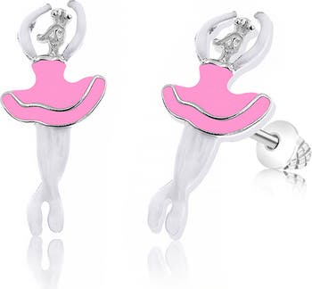 Pretty ballerinas in bright pink tutu's dance on whimsical stud earrings that sparkle in the light with each twirl.