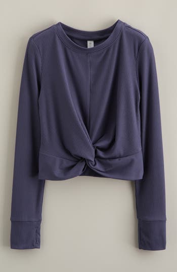 They'll love the twisted front hem of this softly ribbed T-shirt featuring a cropped hem.