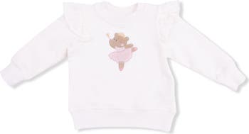 An adorable pirouetting bear is appliquéd at the center of a stretch-enhanced organic-cotton-fleece sweatshirt that's made even sweeter with ruffles at the shoulders.