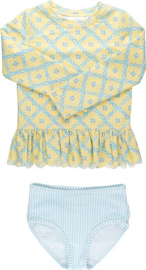 A ruffled drop-waist skirt moves with each step your young beachgoer takes in this long-sleeve rashguard made with built-in sun protection.