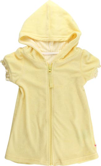 A full-zip placket makes it easy to get your young beachgoer into this cozy terry cover-up dress featuring an attached hood that blocks out the sun.