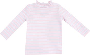 A ruffled neckline and pretty stripe print turn a basic long-sleeve T-shirt into a fashionable go-to on cold-weather outings.