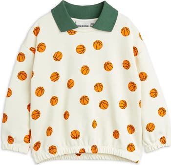 Small basketballs score lots of points on a polo-collar sweatshirt made for kids who like to play and win in the comfort of breathable organic cotton.