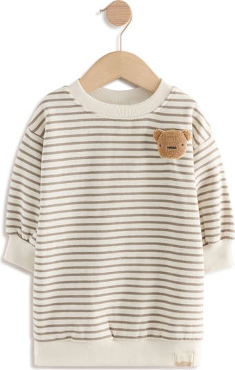 A 3D bouclé bear head lends tactile appeal to a soft and cozy cotton-rich sweater-dress wrapped in zippy stripes.