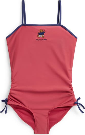 Watch them splash and play in this open-back one-piece swimsuit featuring an embroidered bear on the front and ruched sides.