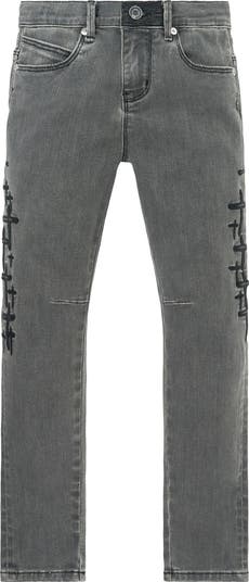 Signature cross embroidery distinguishes these kid-size skinny jeans cut from stretchy denim and finished with reinforced stitching at the inner thighs.
