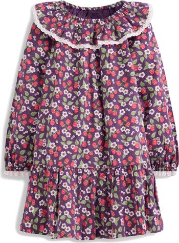 A field of raspberries enhances the sweet look of a flouncy cotton dress that's accented with dainty lace touches at the cuffs and ruffled neck.