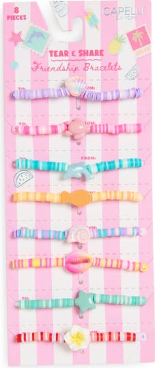 Perfect for youngsters to share with friends, this set of assorted stretch bracelets comes on a tearable cardboard backer that's meant to be divided.
