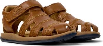 A footbed of rubber and recycled rice husks brings natural movement and ergonomic comfort to this kid-size leather sandal that's ready to play.