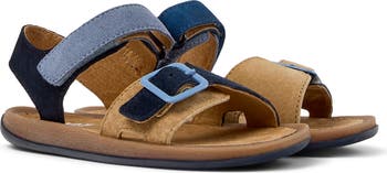 The label's signature complimentary but not identical design adds to the playfulness of this strappy leather sandal set on an ergonomic footbed made of rubber and recycled rice husks for natural movement.