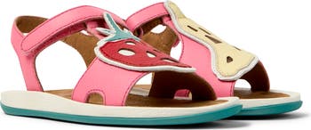 The label's signature complimentary but not identical design adds to the playfulness of this fruity leather sandal set on an ergonomic footbed made of rubber and recycled rice husks for natural movement.