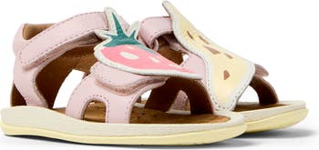 The label's signature complimentary but not identical design adds to the playfulness of this fruity sandal set on an ergonomic footbed made of rubber and recycled rice husks for natural movement.
