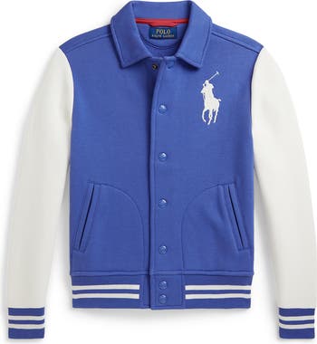 A giant pony icon kicks up the sporty look and feel of a varsity jacket made of all-cotton fleece with a comfy kid size and metallic snaps cinching the cozy feel. Contrast sleeves and striped ribbing at the cuffs and hem add a winning finish to your child's cold-weather style game.