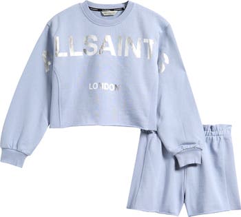 A metallic logo stamps the front of an oversized sweatshirt paired with ruffle-trimmed shorts that'll have your youngster feeling their most relaxed.