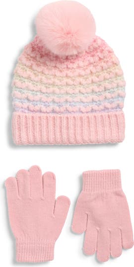 Cold days are cuter and warmer with this pom-topped beanie knit in a bird's-eye stitch of rainbow pastel hues and paired with coordinating gloves.