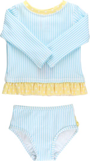Signature ruffles flutter across the hem of this two-piece swimsuit topped by a playful rashguard with built-in sun protection to keep them splashing.