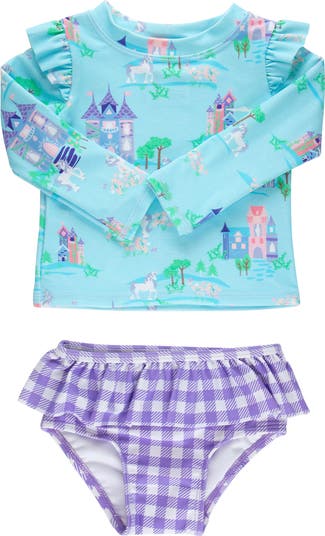 Signature ruffles lend playful energy to this precious two-piece swimsuit with a long-sleeve rashguard and coordinating bottoms.