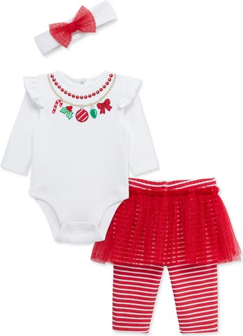 Baby will be ready to celebrate the holiday season in this festive set that pairs a ruffled bodysuit, skirted leggings and a matching headband.