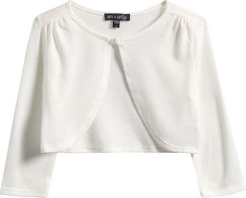 A dainty button holds in place an abbreviated bolero cardigan that's a graceful and lightweight finish to your child's look.