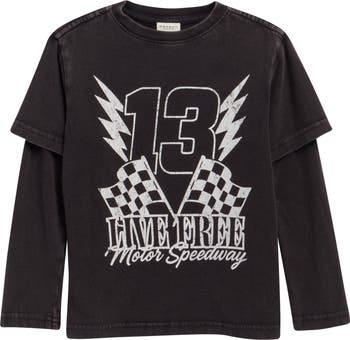 The layered look of this graphic T-shirt keeps your kid on-trend in school and at the skate park.