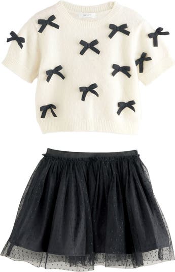 Your little one will make a pretty party debut in this fuzzy bow-bedecked sweater that's paired with a flouncy, dotted-tulle skirt.