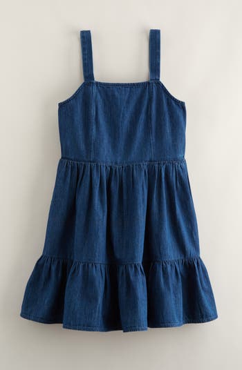 They'll love to twirl is this flouncy tiered dress made from soft chambray and detailed with a charming bow in the back.