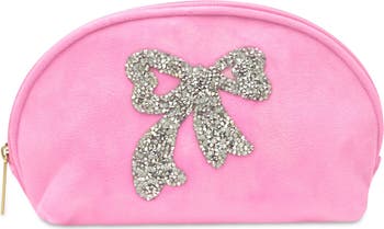 A jewel-encrusted bow appliqué brings shimmery charm to a kid-sized cosmetics bag perfect for storing their favorite trinkets while on the go.