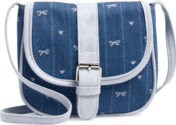 Pretty embroidered bows float across this cute kid-sized saddle bag made from soft denim and is styled with a crossbody strap for easy carrying.