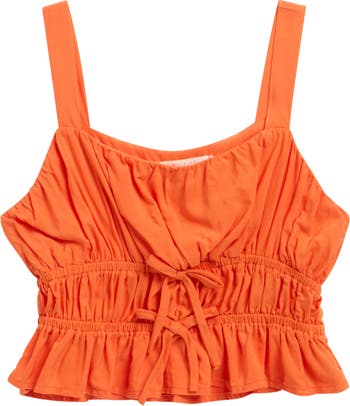 Put the perfect finishing touch on your young trendsetter's warm-weather rotation with this flared peplum top shaped with a softly shirred bodice and detailed with playful bows at the front.