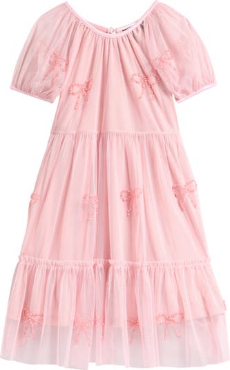 An airy mesh overlay adorned with glitzy bow embellishments adds to the sweetness of this party dress sure to have your kiddo twirling endlessly.