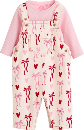 Supercute hearts and bows pattern ultra-soft cotton overalls paired with a long sleeve ribbed bodysuit.