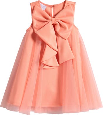 They'll love the cascading mesh overlay that lends party-ready movement to this stretchy scuba dress with a dramatic bow in the front.