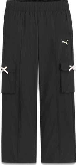 Kids will love the retro-sporty style and handy pockets of these stretch-woven pants detailed with tiny bows at the cargo pockets.