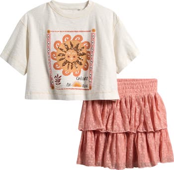 Your budding trendsetter will be ready to shine in this boxy graphic T-shirt and tiered lace skirt set they can mix and match for endless combinations.