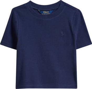A stretchy ribbed knit shapes a boxy, solid-hued T-shirt authenticated with an embroidered polo rider at the chest.