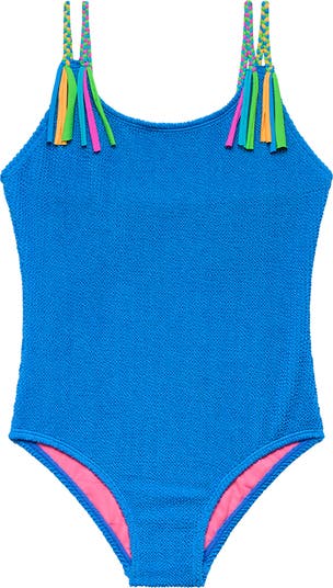 Your kid will love the textured design on this one-piece swimsuit made with fringe-embellished braid straps that are kid approved.