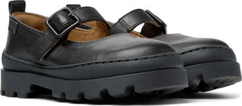 An adjustable mary jane strap adds adorable charm to a leather flat grounded by a cushioned footbed and play-ready rubber lug sole.