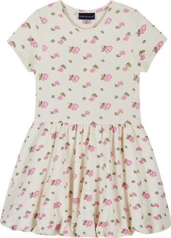 A bubbly hem adds to the fun of this textured cotton-kissed dress covered in darling blooms.