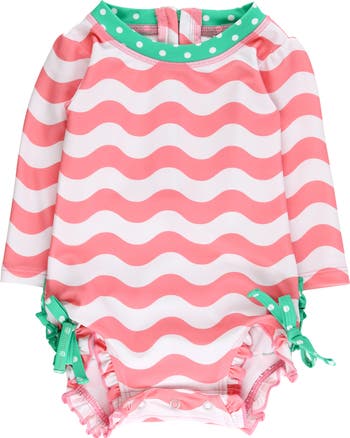 Get your little splasher ready for a day of water fun in this long-sleeve one-piece swimsuit featuring a fun pattern, signature ruffles and built-in sun protection.