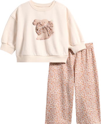 An adorable bunny topped with a charming bow appliqué centers this soft sweatshirt paired with floral pants that bring cozy comfort to your little trendsetter's day.